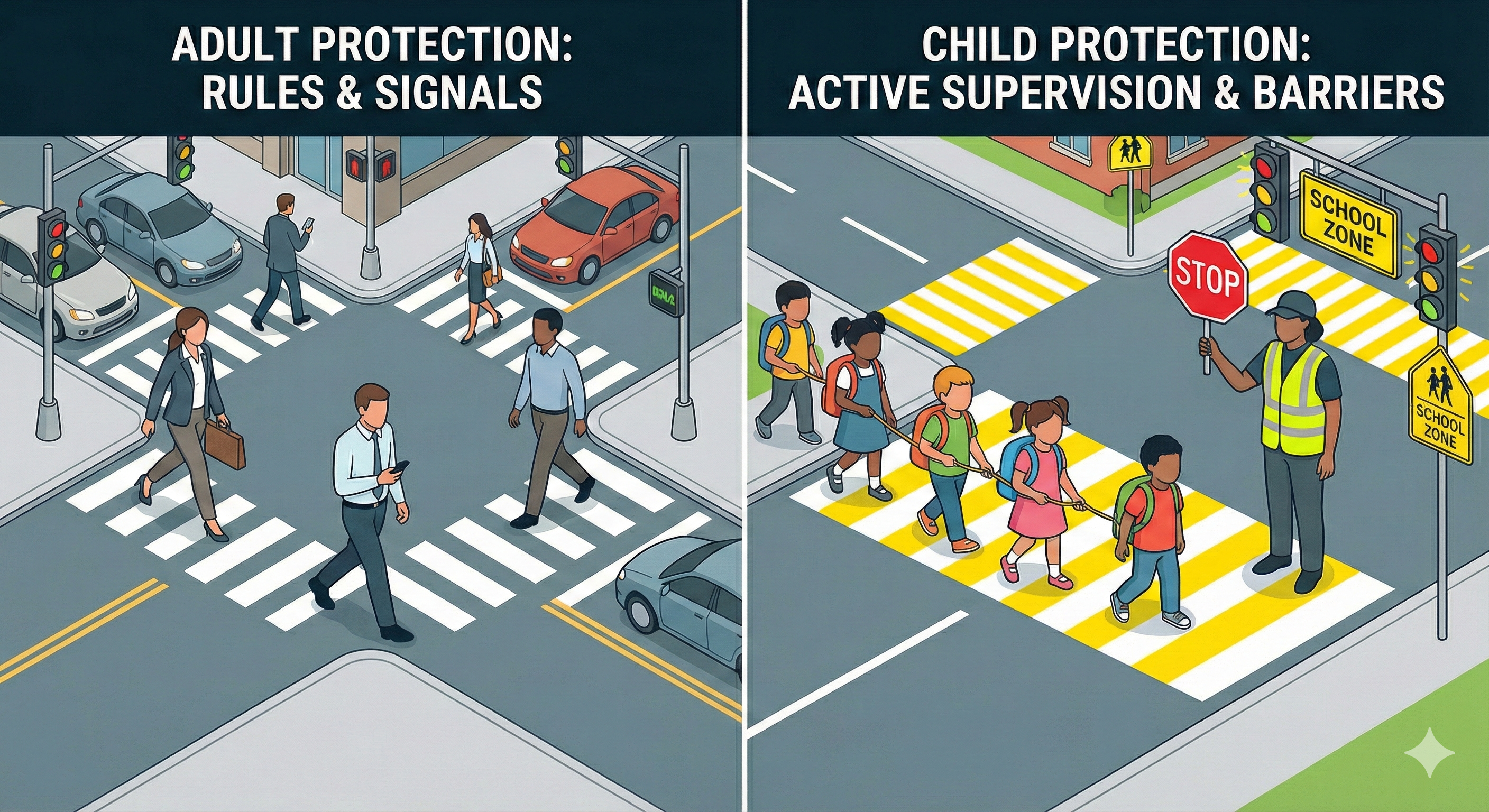 - For adults, we provide a pedestrian crossing. We assume they have the agency to look left and right, judge the speed of traffic, and cross safely. We grant them the freedom to navigate the risk.